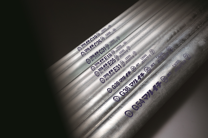 外層に亜鉛めっき帯鋼、中間層に帯構、内層に耐水紙を用いた管にひだ付けした構造です。特定電気用品以外の電気用品なので、コンクリート埋設はもとより、特殊場所を除いた場所の定圧屋内配線に鋼製電線管と同様に施設できます。
